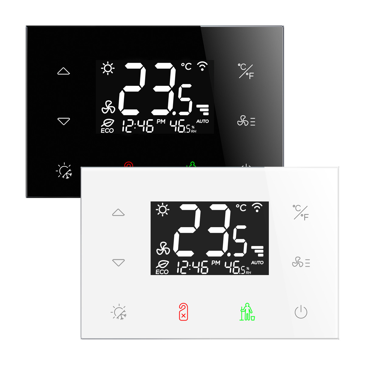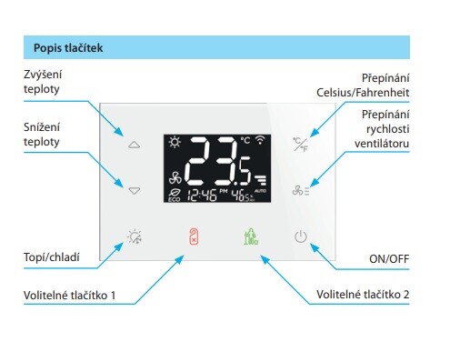 Termostat slouží pro ovládání 2 a 4 trubkových fancoilů, VRV a jiných HVAC zařízení. Termostat zaujme elegantním skleněným dotykovým panelem, který přináší sofistikovanou alternativu k běžným plastovým termostatům. Upravte si RFTC-3 podle svých potřeb díky možnosti plně přizpůsobit jednotlivá tlačítka.