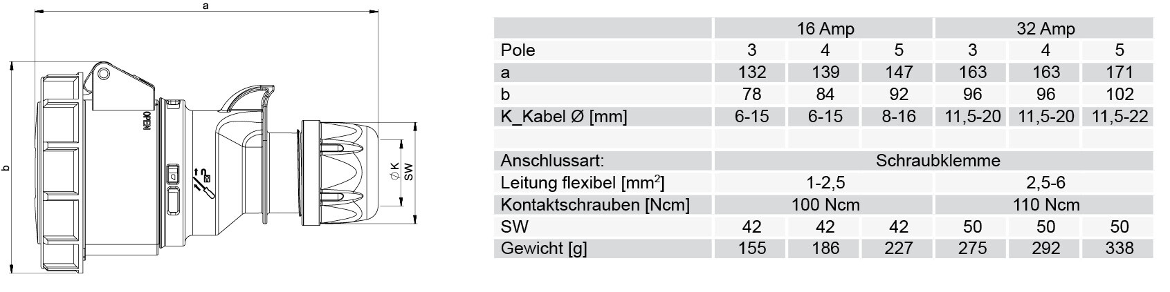 | Otvor pro zavedení kabelu Vývodková matice | Počet pólů 4 | Materiál Plast | Hodnota proudu IEC 32 A |