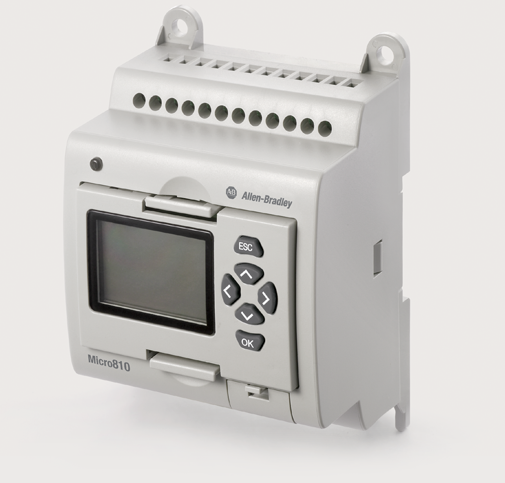 Jakožto nejmenší představitel řady Micro800 jsou automaty Micro810 k dispozici v 12 v/v verzi s 8 A výstupy, díky čemuž odpadá nutnost použití externích relé. Micro810 zahrnuje vestavěné funkční bloky chytrých relé, které lze konfi gurovat pomocí displeje LCD 1,5" a klávesnice. Tyto funkční bloky obsahují časovač zpoždění (TON), denní čas, týdenní čas a roční čas pro aplikace vyžadující programovatelný časovač a řízení osvětlení. Programování lze rovněž realizovat nahráním programu přes programovací port USB s využitím softwaru Connected Components Workbench.