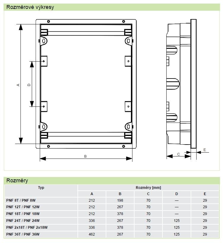 Rozvodnice PNF jsou určeny zejména pro domovní aplikace. Jejich design je přizpůsoben montáži pod omítku. Balení obsahuje vlastní rozvodnici, dveře, přístrojové DIN lišty, N + PE svorkovnice, čelní kryt s výřezem pro přístroje, záslepku neobsazených pozic a upevňovací materiál.