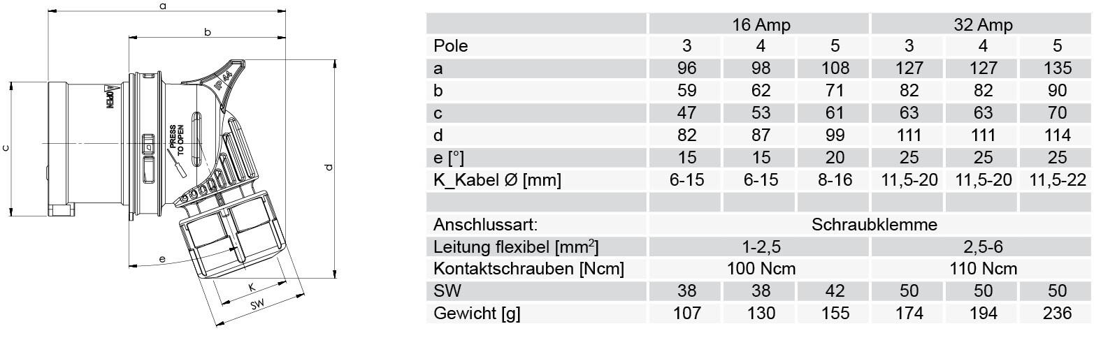 | Otvor pro zavedení kabelu Vývodková matice | Počet pólů 5 | Materiál Plast | Hodnota proudu IEC 32 A |